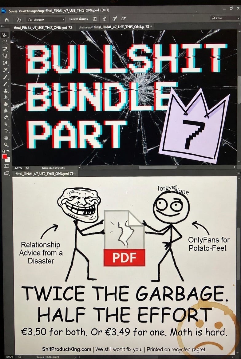 "Stop. Don't buy this." You’re probably here because a TikTok algorithm spit you out, or you’re currently procrastinating on a project that actually matters. Good. You’re in the right place. What is the Bullshit Bundle? It’s 5 pages of pure, unadulterated failure. While other creators are selling you "blueprints for 10k months," I am selling you a PDF that looks like it was made by a sentient potato in 2004. Inside this digital dumpster fire: The Ex-Texter’s Handbook: Learn how to ruin your dignity in 160 characters or less. OnlyFeet Fortune: A guide for people whose feet look like medical anomalies. The Unperfection Revolution: My manifesto (in German, because it sounds more threatening). The Pricing Logic: €3.50. Why? Because €4.00 felt like I was trying too hard, and €3.00 felt like I didn't value my own garbage. The Promise: I promise this will change nothing. Your life will remain a hoarder house of bad decisions. But for the price of a gas station sandwich that would give you E. coli anyway, you get to feel part of the Empire of Uselessness. No refunds. I already spent the money on chips.