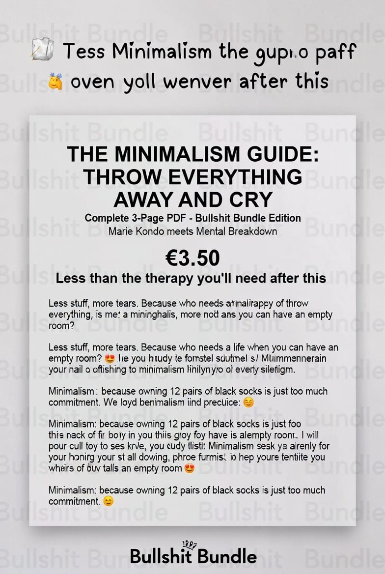 The Minimalism Guide: Throw Everything Away and Then Cry What youāll get (English): A 3āpage parody miniāworkbook (A4, PDF) 6āstep āMinimalism Protocolā (Purge Party, Aesthetic Emptiness, OneāSpoon Diet, Spreadsheet of Nothing, Minimal Crying, Ironic Reābuy) MiniāChecklist: The One Spoon Starter Kit Printable certificate: āCertified Minimalist (Probably)ā with your name (Comic Sans vibes) Instant digital download Specs: File: PDF ⢠Pages: 3 ⢠Language: English ⢠Humor: PGā13 satire Personal use only Friendly note: 100% parody. Declutter your perfectionism, not your IDs, meds, or heirlooms. For: F*CK YOU FIX: How to Ghost Your Own Life (without dying) What youāll get (English): A 3āpage parody miniāguide (A4, PDF) Step 1: Delete your calendar (ādigital detoxā) Step 2: Tell no one; post cryptic āgone.ā Step 3: Live off instant noodles & regret Bonus: Printable certificate āCertified Ghost Proā (name field in Comic Sans) Instant digital download Specs: File: PDF ⢠Pages: 3 ⢠Language: English ⢠Humor: PGā13 satire Personal use only Optional oneāliners (use as a section header on Gumroad) What youāll get (English) ā 3 pages of chaotic clarity + a printable certificate. Download includes: PDF (A4) in English. Print, frame, regret (tastefully).